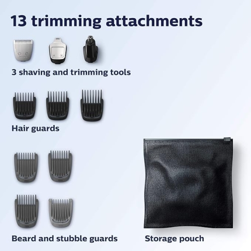 - 13 pieces for all of your grooming needs: Beard and stubble trimming and maintenance, precision trimmer allows exact placement for sharp lines, nose and ear trimmer taking care of unwanted hairs
